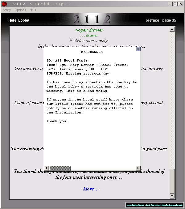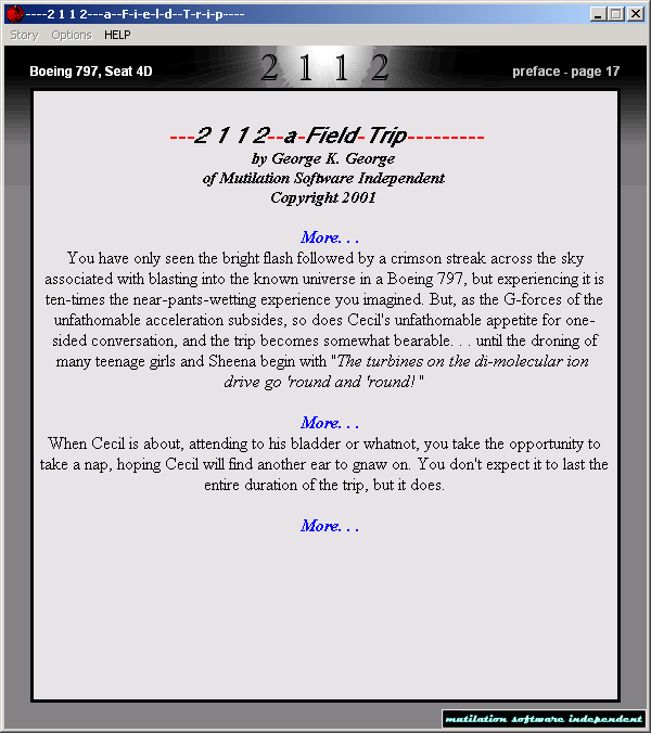 2112: A Field Trip is an adventure game released in 2001. It was developed by Mutilation Software Independent and published by K. George.