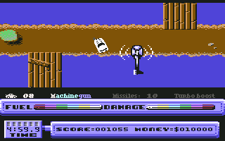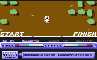 The player controls a white car that travels up (and then down) a tricky landscape filled with water, bumps, trees, and enemy vehicles. Cash is earned by completing levels, with an initial $10,000 available. These funds are spent at garages to buy extra fuel, repair the car’s armour, and put add-ons for the car. These include a turbo-jump (allowing the car to get airborne unassisted, rather than relying on jumps) and waterproofing.