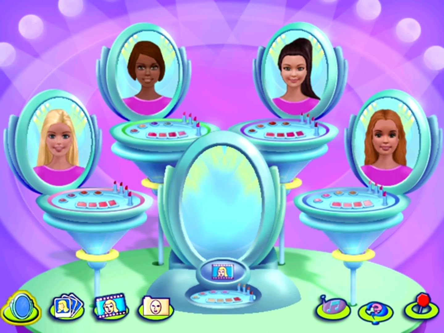 Barbie Digital Makeover lets you create new looks for yourself or Barbie and her friends. Input your own digital image into the computer, and choose from hundreds of hair and makeup styles to create endless new looks. Or make over Barbie, Christie, Kira, and Teresa, for more fun. Use Barbie’s magical mixing devices to make your own original textures, colors, and personalized makeup.