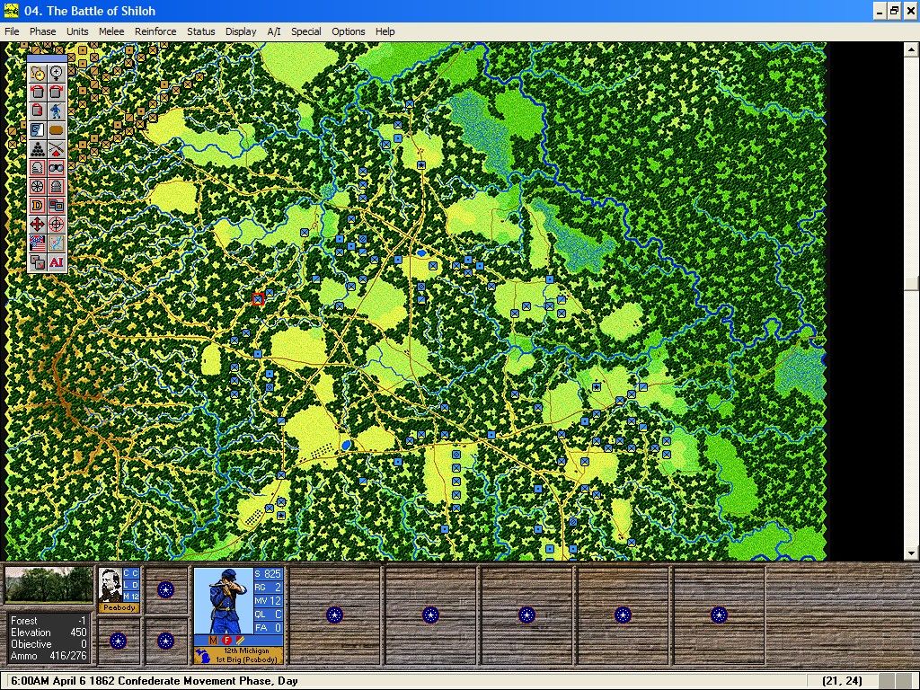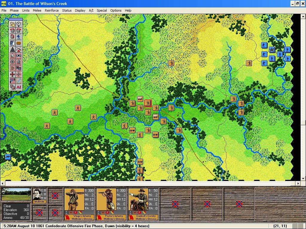 The basic platform for the Battleground series involves individual infantry and cavalry regiments, artillery batteries, and commanders. All are rated for strength, firepower, weaponry, morale, and movement. As a unit takes fire, it may become fatigued, disordered, or routed to the rear. Players compete against the computer’s artificial intelligence or against another player via modem. Players may try a variety of 25 individual scenarios, or refight the entire Battle of Shiloh. A Fog of War option enhances playing against the computer, as it hides units that are not in direct view of the enemy. The game also includes scenarios related to the Battle of Wilson’s Creek and the Battle of Prairie Grove.
