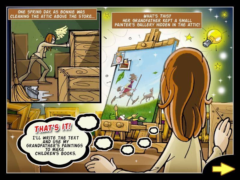 In Bonnie’s Bookstore, the titular character runs a bookstore which she has inherited from her deceased grandfather. One day while cleaning the attic, she discovers a series of paintings apparently created by him. The paintings appear to depict scenes from popular children’s stories. In a flash of inspiration, Bonnie decides to become an author, writing updated versions of these classic stories while using her grandfather’s paintings as the illustrations.