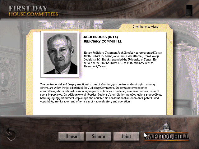 Capitol Hill is an educational and strategy game released in 1993. It was developed by Amazing Media, Inc and published by The Software Toolworks, Inc.