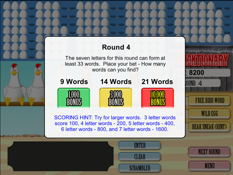 Chicktionary is a word game available on the Microsoft Internet search page. Chicktionary was developed by Blockdot, a Dallas, Texas based developer of games and branded entertainment applications. The game was originally developed as “Fowl Words” but later changed after it was concluded that the play on words “fowl” would be confused with “foul” and alienate potential players.