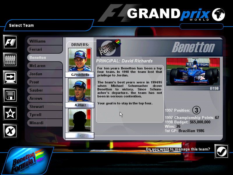 Grand Prix World is very different from the preceding games, even though they largely share the same code base, the major changes coming in the interface design and negotiation modules with sponsors, drivers, engineers. This results in fewer ‘freak’ results such as player being able to sign top-line drivers for the bottom-ranking teams, or being able to score points with said teams without major reorganisation of the team.