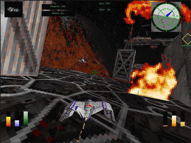 The player is in control of a prototype spacecraft (the “Hellbender”) and must fly it around a map, destroying various targets and reaching checkpoints. The Hellbender has no inertia and thus cannot crash. There are ten weapons available. The Valkyrie and Laser cannons have unlimited ammo, but there are also dumbfire Sledgehammer rockets, homing Viper missiles, and devastating Doomsday mines. Many more weapons are available by collecting power-ups during gameplay.