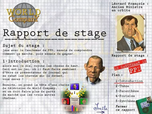 Les Guignols de l’Info: Le Cauchemar de PPD is a simulation game released in 1996. It was developed by In Visio, SARL and published by Canal+Multimédia and Philips Média France.