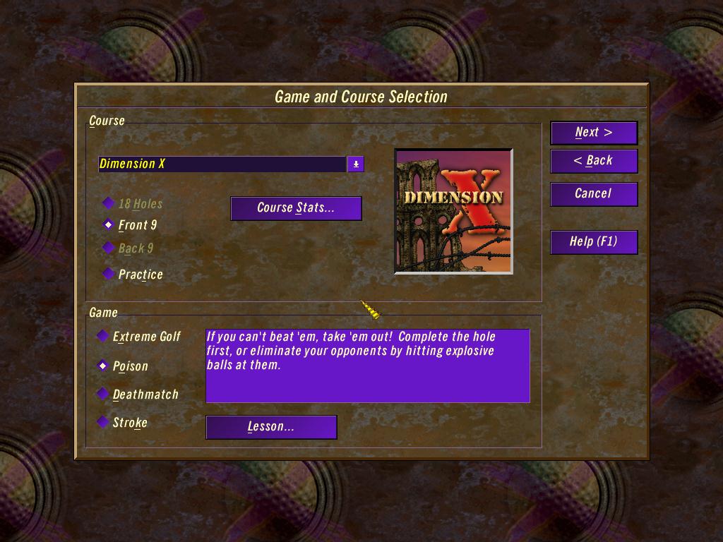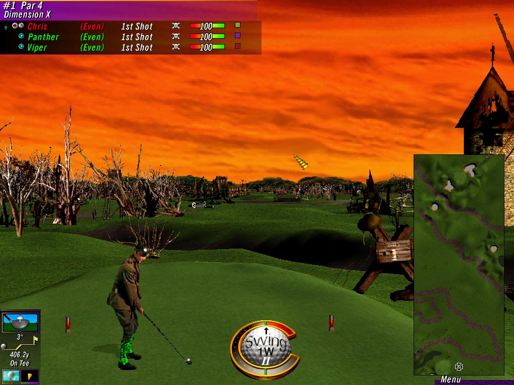 Links Extreme features game modes and courses that are unusual to the sport of golf. Among the four unique game modes is Armadillo Al’s Demolition Driving Range, in which the player uses exploding golf balls to hit targets such as armadillos, cows, and hot air balloons. The Extreme Golf mode features 17 pranks which affect a player’s golf ball in different ways that can be harmful or beneficial to the player. In the Deathmatch and Poison game modes, the player is given a variety of exploding golf balls that are used to injure and ultimately kill the opponent golfer.The Poison mode differs in that the player can choose between playing the course or attacking the opponent golfer. The game also includes stroke play.