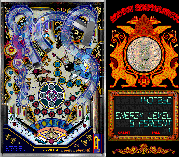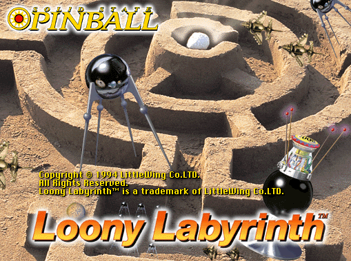 Loony Labyrinth is the 4th pinball simulator created by LittleWing. It has one table with classic proto-Greek mythological themes. As an explorer and later as the legendary hero Theseus, the objective is to first find and activate the time machine, and then go back to ancient times and defeat the Minotaur.