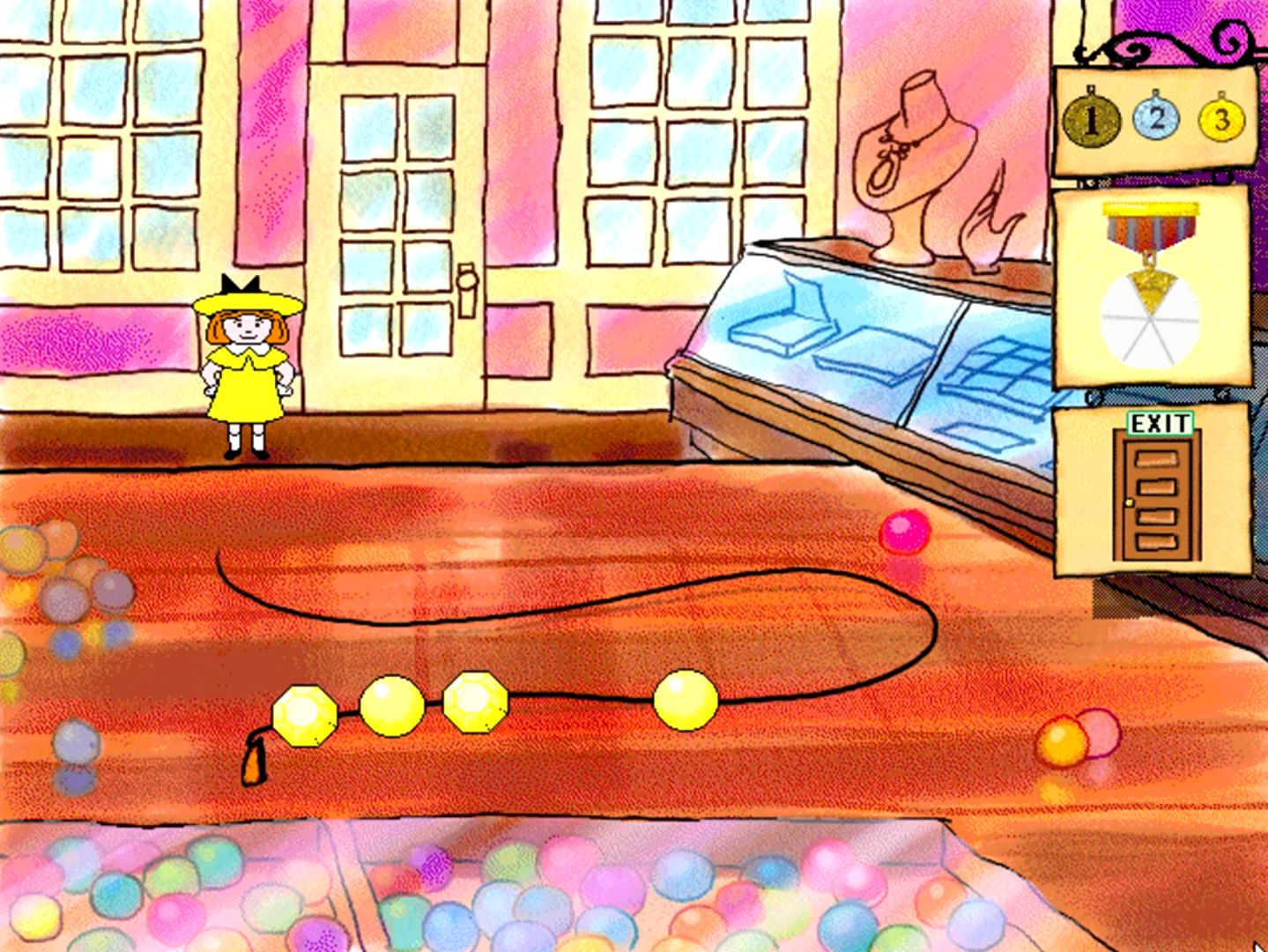 On the kindergarten disc Madeline explores her neighborhood, meets the characters and participates in activities. At the general store she has to use her spelling skills to complete tags. In the playroom she has to match labels for English, French and Spanish words to toys. In the magic theatre children can sing along with Madeline songs and videos. In the jewelry store pattern recognition skills are developed by putting beads of different colours and sizes in the correct order to create a necklace, and so on.