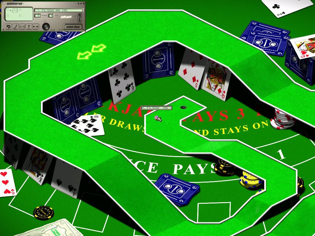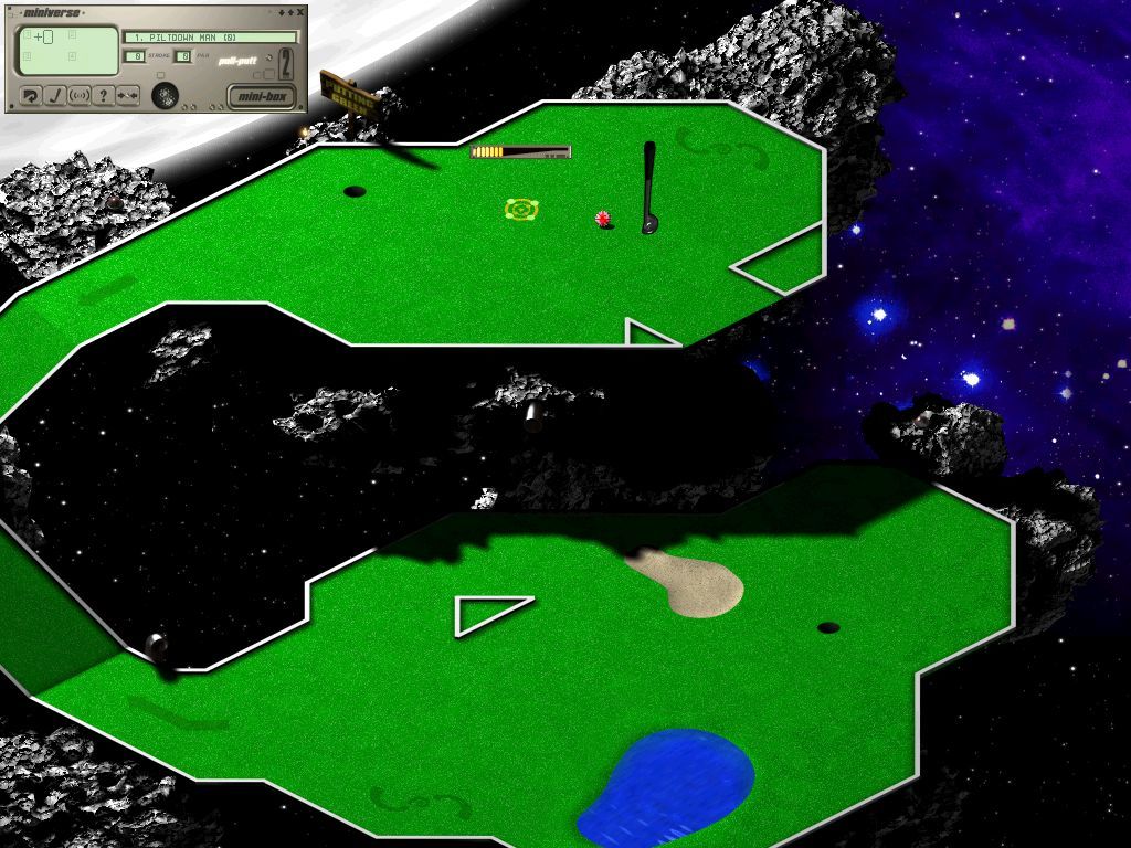 Mini Golf Master is a Sports game developed by No.2 Games and published by eGames in 1999.Mini Golf Master has nothing to do with knocking a ball through a clown’s mouth, but is more of an arcade experience. Here you are presented with several highly creative courses such as a war-torn battlefield (complete with machine gun fire and land mines), a rooftop, and a city street.