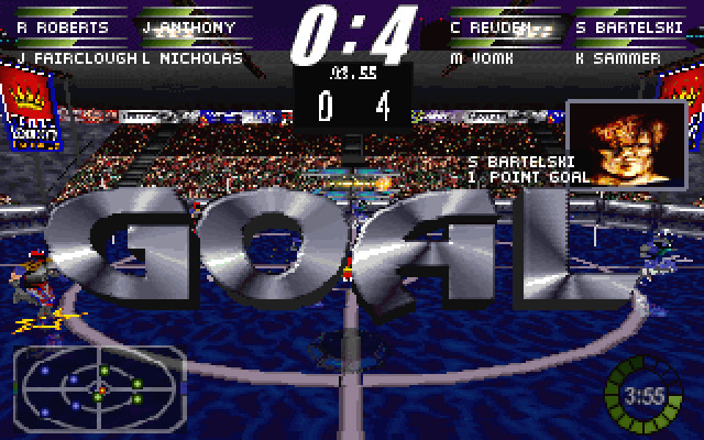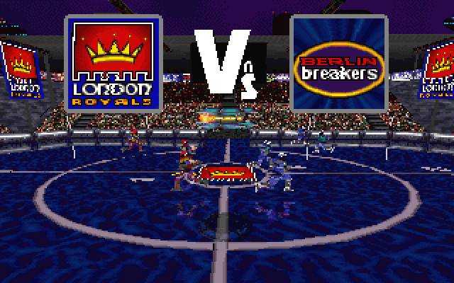 League of Pain combines elements of rugby, soccer/football and basketball in a futuristic sport that is violent and without rules. The objective of the game is to charge up the plasma ball, and to then launch it through the ring that floats above the centre of the play area. The points earned from a goal are determined by the distance from the ring. The ball is charged by reaching the charger in the opponents side of the arena. In the PlayStation version, once charged, the ball will glow purple to indicate the home team charged it, or yellow to indicate the away team charged it. For the Windows/DOS version, the ball will glow blue to indicate a home team charge and green to indicate an away team charge. If the player scores while the ball is charged with the opposing team’s color, it will count as an own goal. Despite the futuristic set-up, the game plays in much the same way as standard sports games with the ability to tackle, slide and shoot but also allows the player to fight with their opponents.