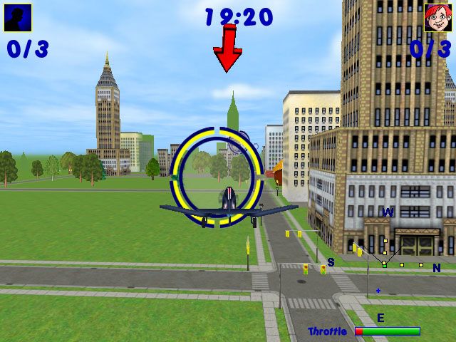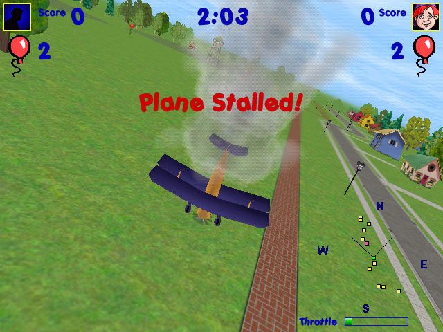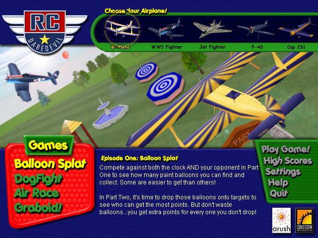 RC DareDevil puts you behind the controls of a high-performance radio-controlled (RC) airplane. In a wild ride with a cast of zany characters, you careen through airborne challenges, including balloon splat targeting and air races, in one of five planes based on actual RC designs. The game is set in expansive environments including a city, a neighborhood playground, and an amusement park. A course progress map, directional compass, fuel gauge, and throttle help you navigate the courses. Drop paint-filled balloons to slow your opponent down or shoot them with BB pellets and watch them nosedive. Use Tornado Speed, Flash, and Signal Disruptors to throw off your opponent.