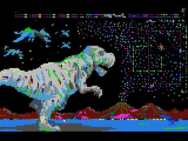 SimTunes is a children’s software toy designed by Toshio Iwai and released by Maxis in 1996. It involves painting a picture using large pixels, where each color represents a musical note. The player places up to four different-colored Bugz, which represent musical instruments or vocal syllables, on this picture, and can change their starting directions and relative speeds. The Bugz crawl over the picture, playing notes corresponding with the colors; and they turn, move randomly, or jump in response to function symbols that can be added to the dots.