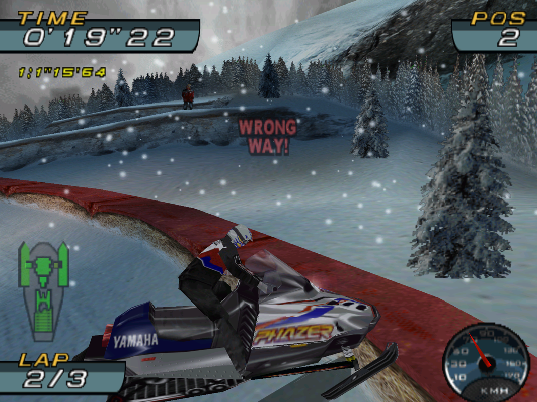 Sno-Cross Championship Racing is a snowmobile video game. It has seven locations to race on such as the Nagano Olympics, Aspen, and a naval ship graveyard in Murmansk. It also features a level editor that allows players to create their own race tracks.