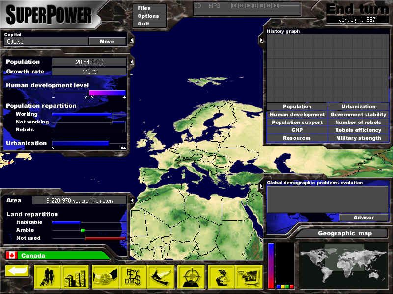 Lead a country to glory, ruin or stable mediocrity in this “geo-political world simulator” of Earth circa 1997.