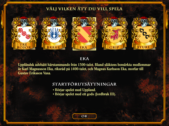 Svea Rike is a 1997 turn-based strategy video game based on the history of Sweden, which became an inspiration to the later-established franchise “Crusader Kings”[citation needed]. The title roughly translates to “Swedish Realm”. A sequel, Svea Rike II, was also made.