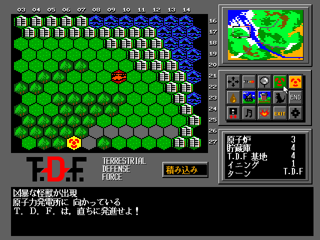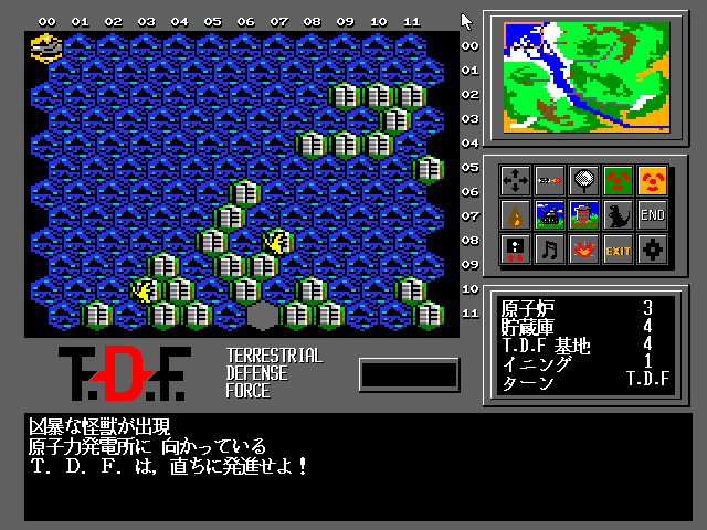 T.D.F. Kaijū daisensō kesshi no genshiro bōei sakusen is a strategy game released in 1987. It was developed by Data West and published by Data West and Apros.