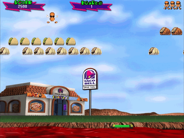 A floppy disc available at Taco Bell locations for use on PC. A Breakout clone featuring a jumping bean character eating Taco Bell products.