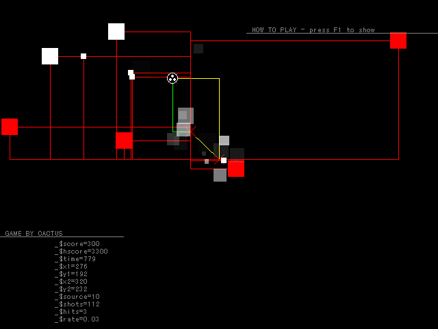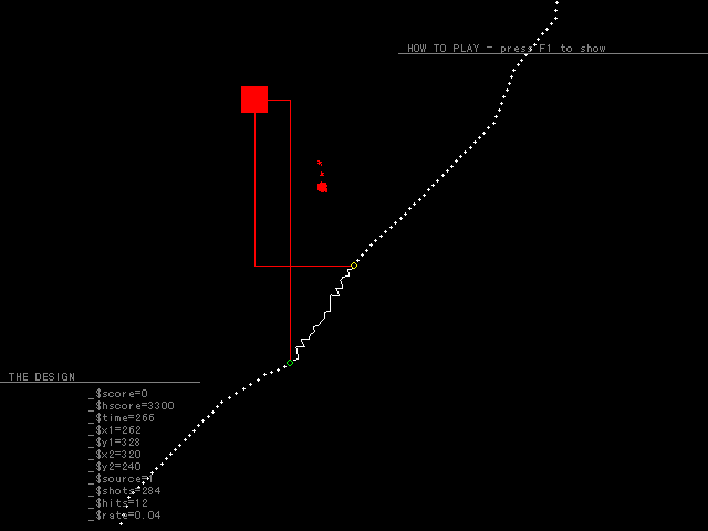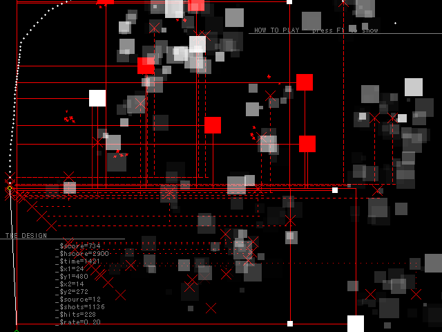The Design is a shooting game where the player simultaneously controls two circles, yellow and green, which can be freely moved in four directions around the screen. They can also shoot bullets outwards, along the line on which both circles lie.