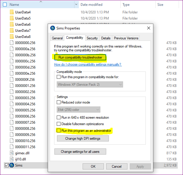 NEXT YOU NEED TO RIGHT-CLICK ON THE FILE “Sims” APPLICATION, RUN COMPATIBILTY MORE OR CHOOSE RUN COMPATIBILTY FOR WINDOWS XP (SERVICE PACK 2 or 3).