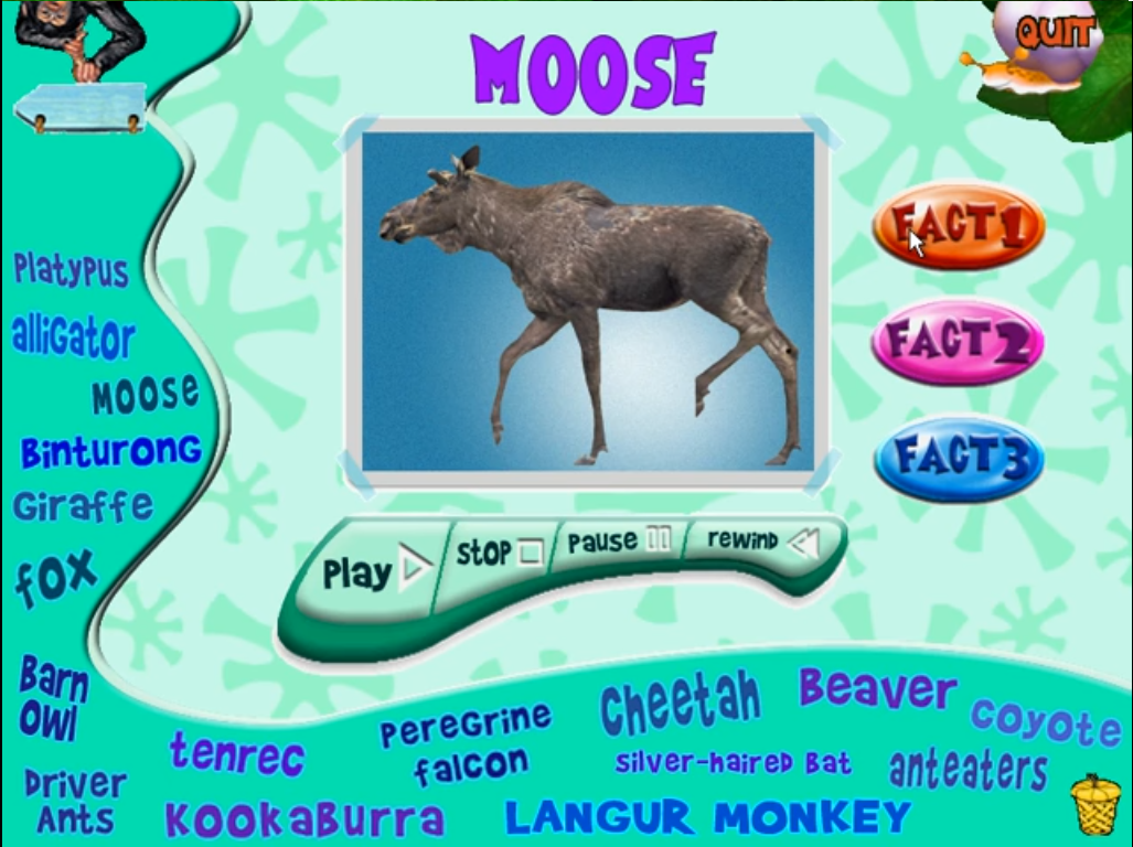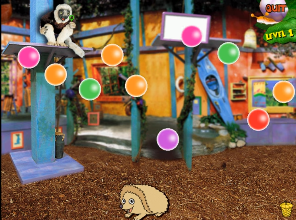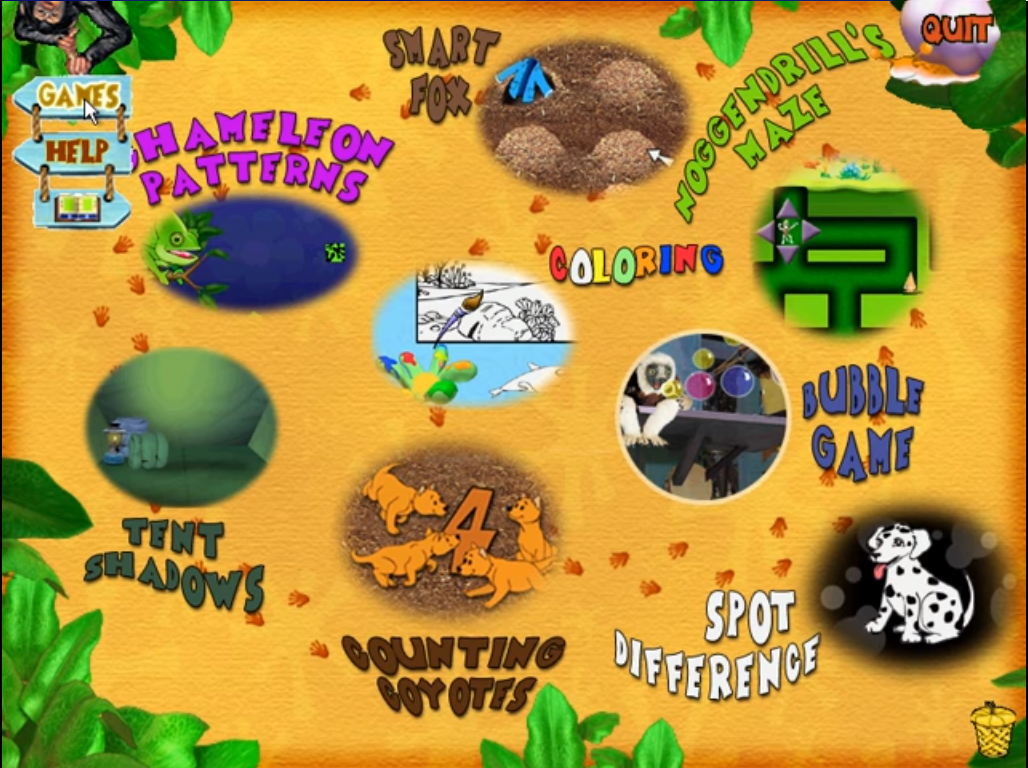 Zoboomafoo: Creature Quest is a game based on the American PBS Kids television series featuring the Wild Kratt brothers. To find a treasure map that the Kratt brothers are looking for, you must play a few mini-games to retrieve the pieces. In the first mini-game, Counting Coyotes, you must match two of the same number together for baby coyotes to help you find that part of the map. The second mini-game is an interactive coloring book with many different environment like the forest, jungle, and desert. In the third mini-game, Chameleon Patterns, you must find the next color in the pattern to get pieces. In Noggendrill’s Maze, you must navigate Zoboomafoo through a maze to find Noggendrill, who has a piece of the map. In Smart Fox, you must match different objects hiding in their burrows, similar to Memory. In Tent Shadows, you can look at a shadow on the tent and figure out which picture it’s a shadow of. In Bubble Game, you must pop bubbles of a certain color with a porcupine. The last mini-game is a spot the difference game, but with animals. You can also learn about certain animals by watching clips from the TV show and facts from the Kratt brothers, but you don’t earn any pieces from it. The entire game consists of clips from the show to learn about different animals, which can also be played back. You can also print out pages in the coloring book.